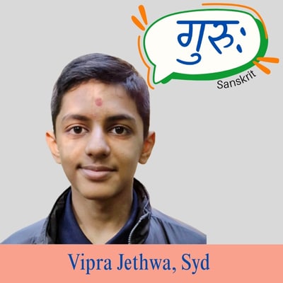 Guru means guide or teacher. This word is commonly used in Hinduism to refer to someone who takes us from darkness into light. In this word Gu (गु) means darkness and Ru (रु) means light. In one’s spiritual journey, a Guru is essential in helping us gain liberation (moksha) by ensuring we stay on the right track – the path of righteousness. I chose this word because it plays a big role in my life! My Guru, His Holiness Param Pujya Mahant Swami Maharaj, has influenced how I live my life and who I am as a person. Due to his blessings, I am able to learn this beautiful language of Sanskrit! I managed to memorise many texts and shlokas in Sanskrit which creates the basis of my moral compass. So my Guru is my life.
