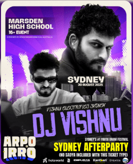 Get your tickets here: https://eventik.com.au/event/festival-or-fair-arpo-irro-festival-2025-sydney-onam-afterparty-non-sadya-ticket/